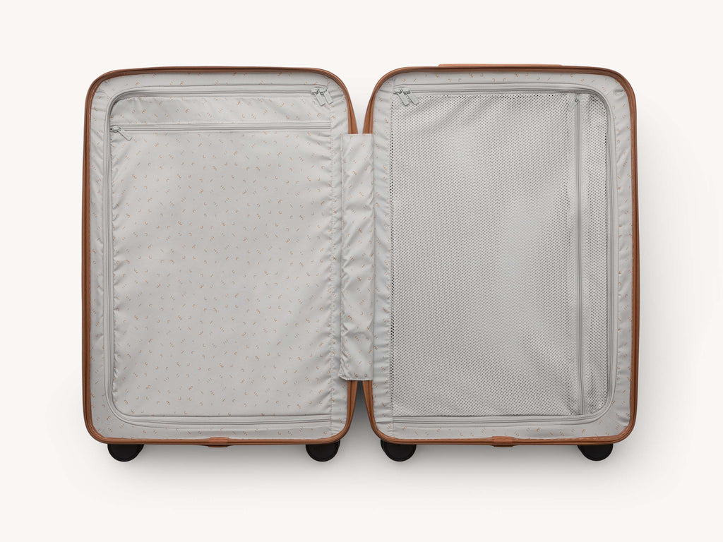 Small+ is a carry-on size for most airlines. Comes with a seamless PC pocket accented with a belt.